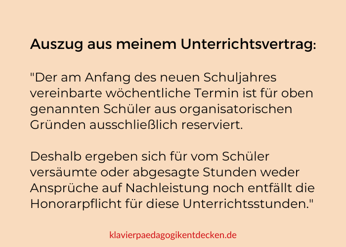Damit ist eigentlich klar: Für versäumte oder abgesagte Stunden ergeben sich weder Ansprüche auf Nachleistung noch entfällt die Honorarpflicht. Außerdem wird darauf hingewiesen, dass die Unterrichtsstunde ein von beiden Seiten verbindlich vereinbarter Termin ist.