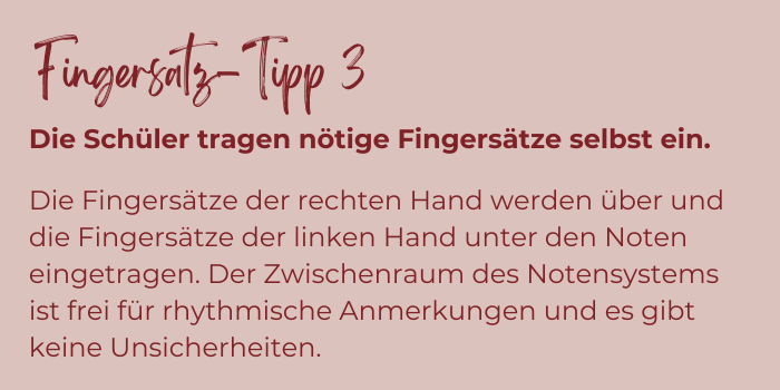 Außerdem erkläre ich meinen Schülern spätestens jetzt, was Fingersatz eigentlich ist: Der Fingersatz ist die Planung von Bewegung und die sinnvolle Aufteilung der Finger, damit eine Stelle gut spielbar wird.
