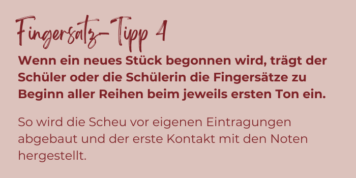 Egal wie flink die Finger der Schüler sind, egal wie gut ihr Gehör und ihre Auffassungsgabe ist, ein guter gelernter Fingersatz hilft ALLEN Schülern. Das Beachten, Notieren und Einhalten ist ein wichtiger Baustein für ein gutes Klavierspiel. Je selbständiger, umso besser.