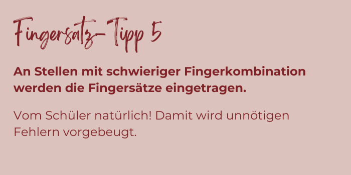 Ich erwähne auch, dass sie so keine Angst vor einem Fehler zu haben brauchen. Sie können eine eventuell falsche Eintragung problemlos korrigieren. Wichtig ist, dass sie nicht übereifrig über jeden Ton einen Fingersatz schreiben. Das wird unübersichtlich und lenkt die Aufmerksamkeit von den Noten weg.