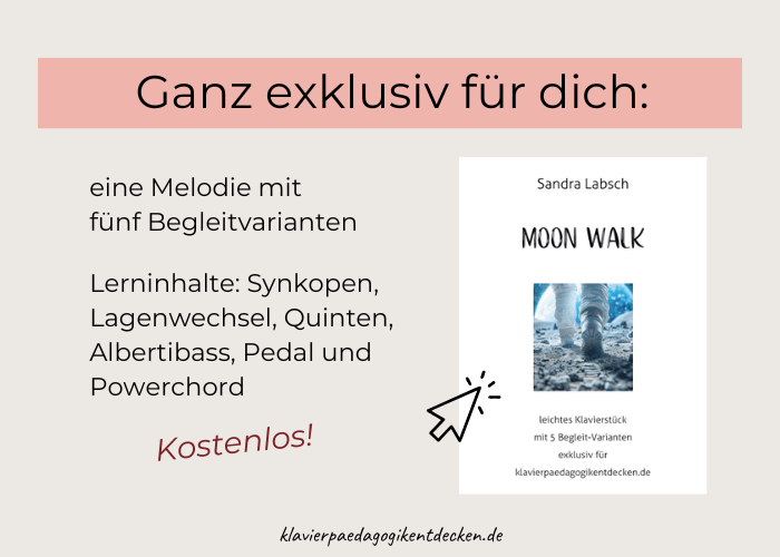 Als Kostprobe und Dankeschön für dein Interesse kannst du dir ganz exklusiv und kostenlos ihr Stück „Moon Walk“ herunterladen. Die schöne Melodie wird auf mehrere Arten begleitet, so dass du je nach Entwicklungsstand deiner Schüler*innen eine passende Version aussuchen kannst.