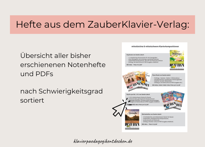 Wenn du neugierig auf Sandras Kompositionen geworden bist, kannst du dich gern im Zauberklavier-Shop umsehen. Alle Hefte von Sandra Labsch gibt es in gedruckter Form, einige auch zur Einzelnutzung als PDF-Download.