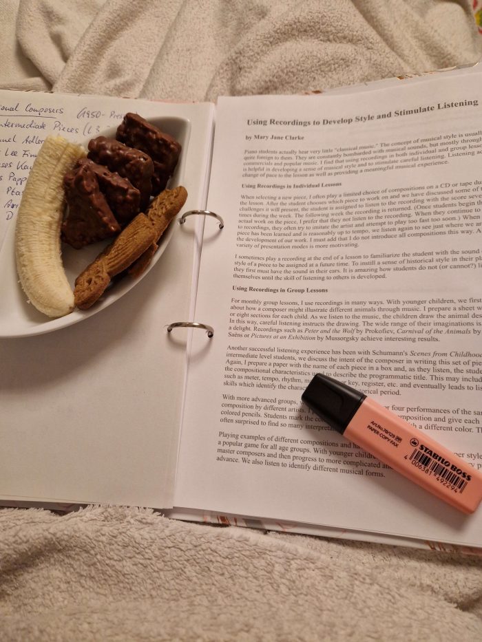 - Über fortgeschrittene Schüler lernen: Ich hatte mir den Kurs „The Intermediate Course: Continuing Pianistic Growth and Development“ (unbezahlte Werbung aus Überzeugung) gekauft und vorgenommen. Ich bin begeistert von den Inhalten, hatte allerdings keine Ahnung wie umfangreich er ist und ich bin noch nicht durch. Ein bisschen Zeit habe ich noch… Mehr dazu etwas weiter unten in meinen Jahresthemen.