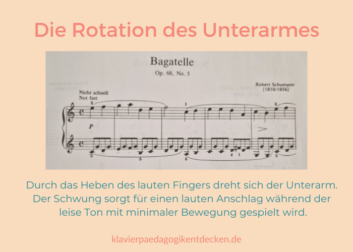 Immer wieder gibt es Stücke in denen die Zweistimmigkeit in einer Hand erfordert wird. Der einfachste Weg zur Umsetzung ist die Rotation des Unterarmes. Wenn ich in meiner Planung sehe, dass ein erstes Stück mit dieser Anforderung ansteht, führe ich die Rotationsübung ein BEVOR wir mit dem Stück beginnen.