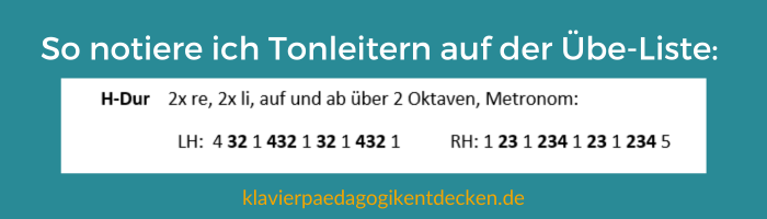 Auch hier gebe ich dem Schüler kein einschüchterndes schwarzes) Blatt, sondern notiere nur den Fingersatz in seiner Übeliste. Die dick gedruckten Zahlen stehen für schwarze Tasten.