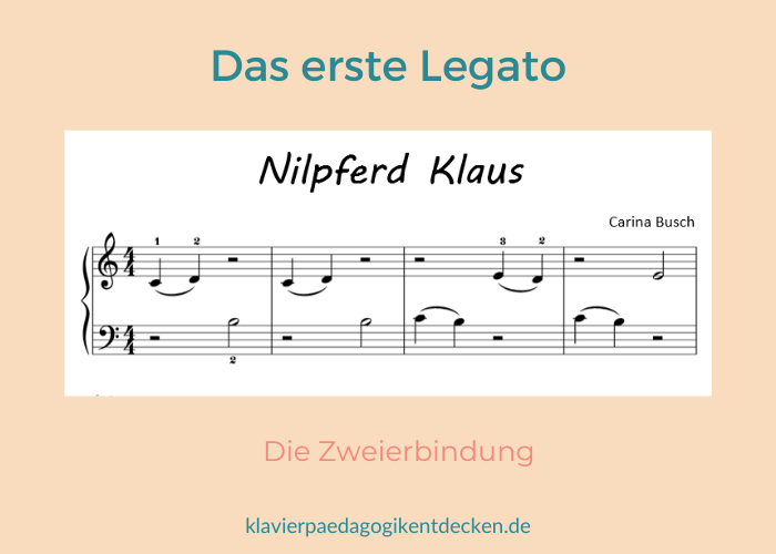 Zuerst werden zwei benachbarte Töne verbunden. Im Idealfall nutzt du eine Klaviermethode, die wenig bis keine Vorgaben zur Artikulation macht. Dann kannst du einfach das Zweierlegato an passenden Stellen eintragen. Zusätzlich habe ich kleine Stücke geschrieben, so dass zuerst das Legato zwischen nur zwei Tönen geübt werden kann.