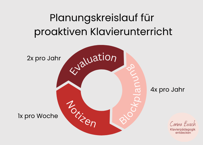 In einer Evaluation werden also Bildungsmaßnahmen, in unserem Fall der Klavierunterricht, analysiert, bewertet und anschließend verbessert. Es werden weitere Ziele und Maßnahmen geplant.