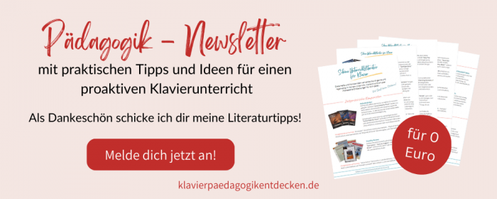 Mehr zur Unterrichtsplanung kannst du in „Klavierunterricht ganz individuell planen“ nachlesen. Wie du eine Klavierschule für deinen Unterricht anpassen kannst, habe ich in „Die beste Klavierschule der Welt“ beschrieben.